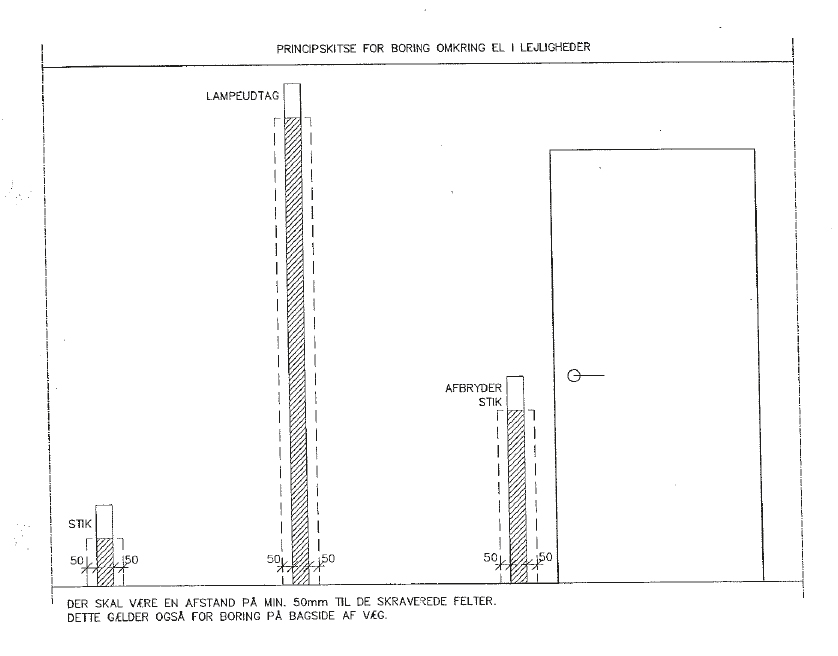 Er der ledningstræk til stikdåser og lampeudtag i væggene, anbefales det at holde ca. 5 cm i afstand til disse træk (se illustration nedenfor). Hvor tyk er den væg jeg skal bore i? Denne kan f.eks. ses i døråbningen. Er der fliser på bagsiden, bør man ikke bore dybere end ca. halv vægtykkelse. Er der indlagt membran (ved vinduer, bruseniche og vådzoner i badeværelset) bør boring undgås. Er skaden sket, skal det borede hul stoppes med silikone samtidigt med at plug’en sættes i.